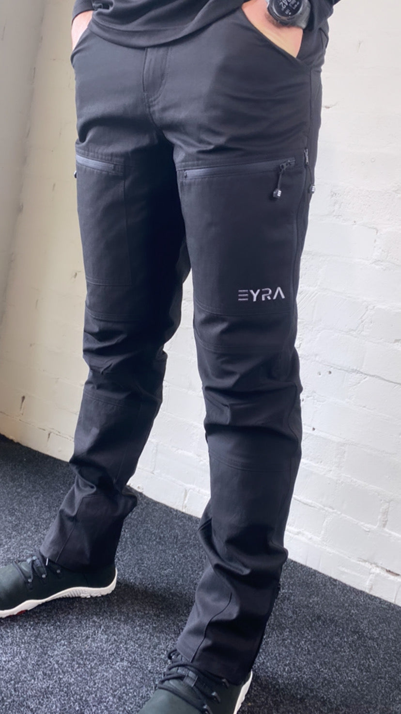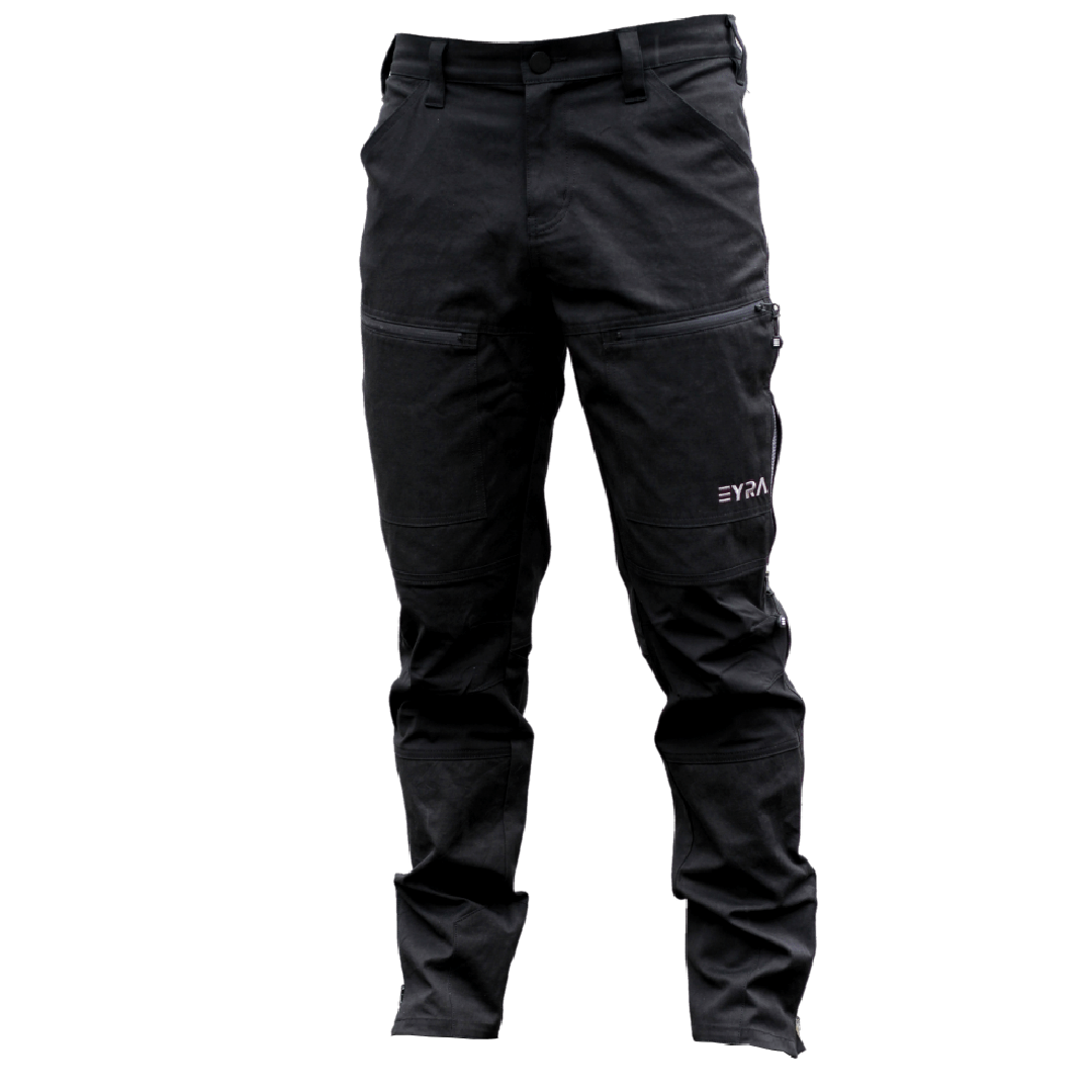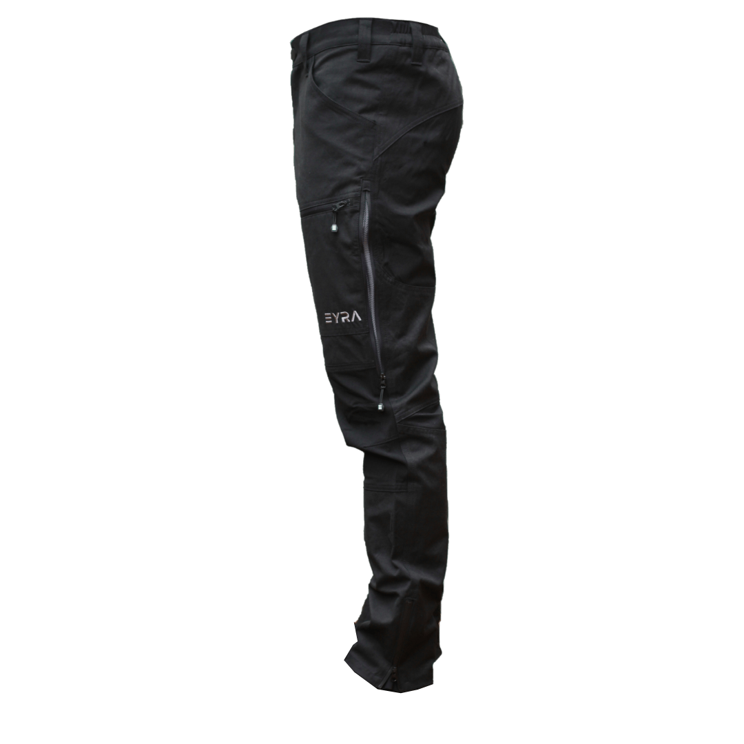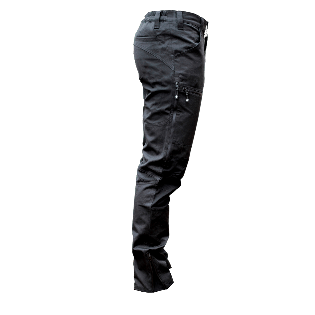 The trousers are constructed with two materials. A strong, reinforced fabric across the lower legs and thighs, and strategically placed stretch panels across the seat, crotch, and knees to enable ease of movement and assist in comfort.